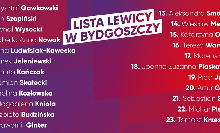W ślad za informacjami zamieszczonymi na profilach Lewicy na Fecebooku - publikujemy poniżej uaktualnioną listę kandydatów na posłów KW Lewica w okręgu wyborczym nr 4 (bydgoskim).